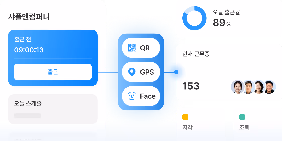 GPS, QR, 안면인증(옵션)을 통해 신뢰할 수 있는 출퇴근 기록을 제공합니다.