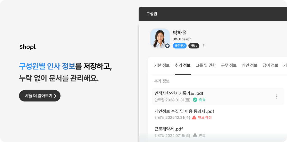 엑셀·종이·이메일 등으로 분산 관리하던 까다로운 인사기록카드도 샤플을 활용하면 구성원별로 필요한 인사 서류를 한곳에 모아 관리할 수 있어 문서 누락이나 분실 위험을 효과적으로 줄일 수 있습니다.