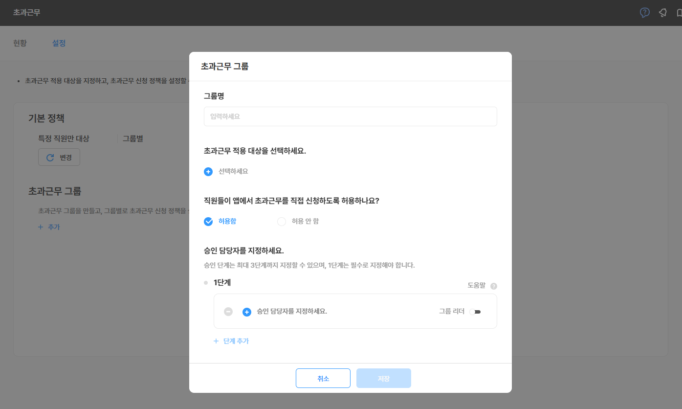 - 허용 안 함 : 직원이 초과근무를 신청할 수는 없고, 리더가 초과근무를 배정하는 것만 가능합니다.